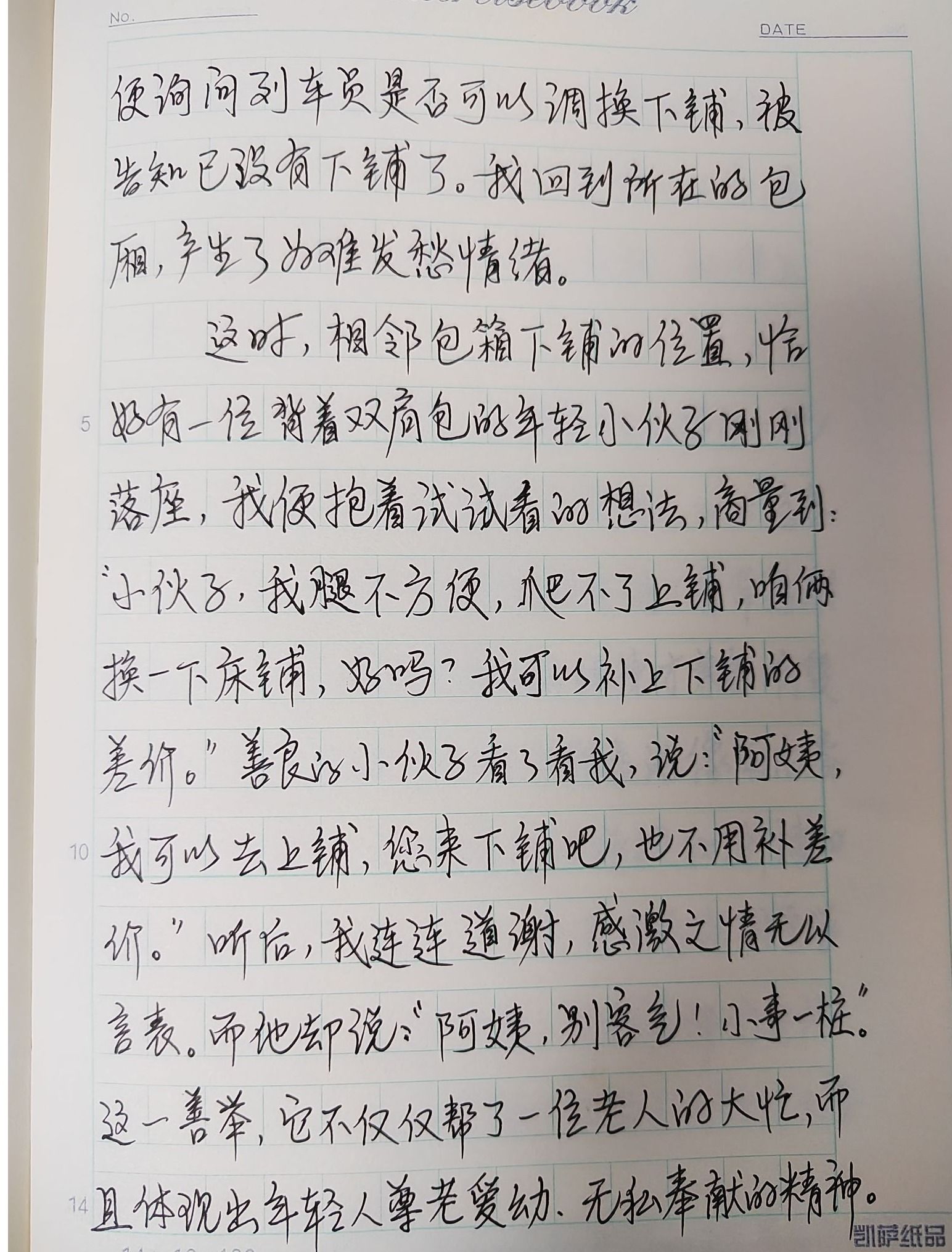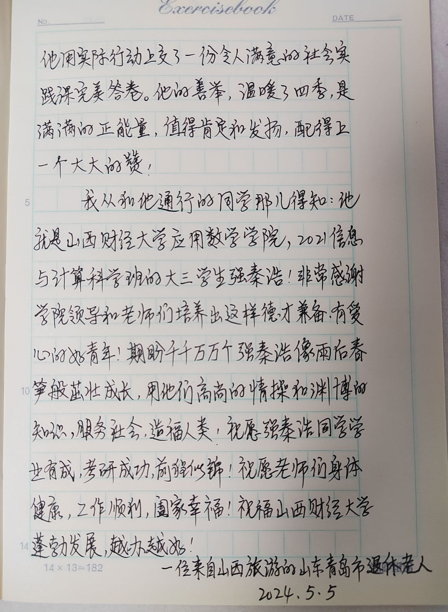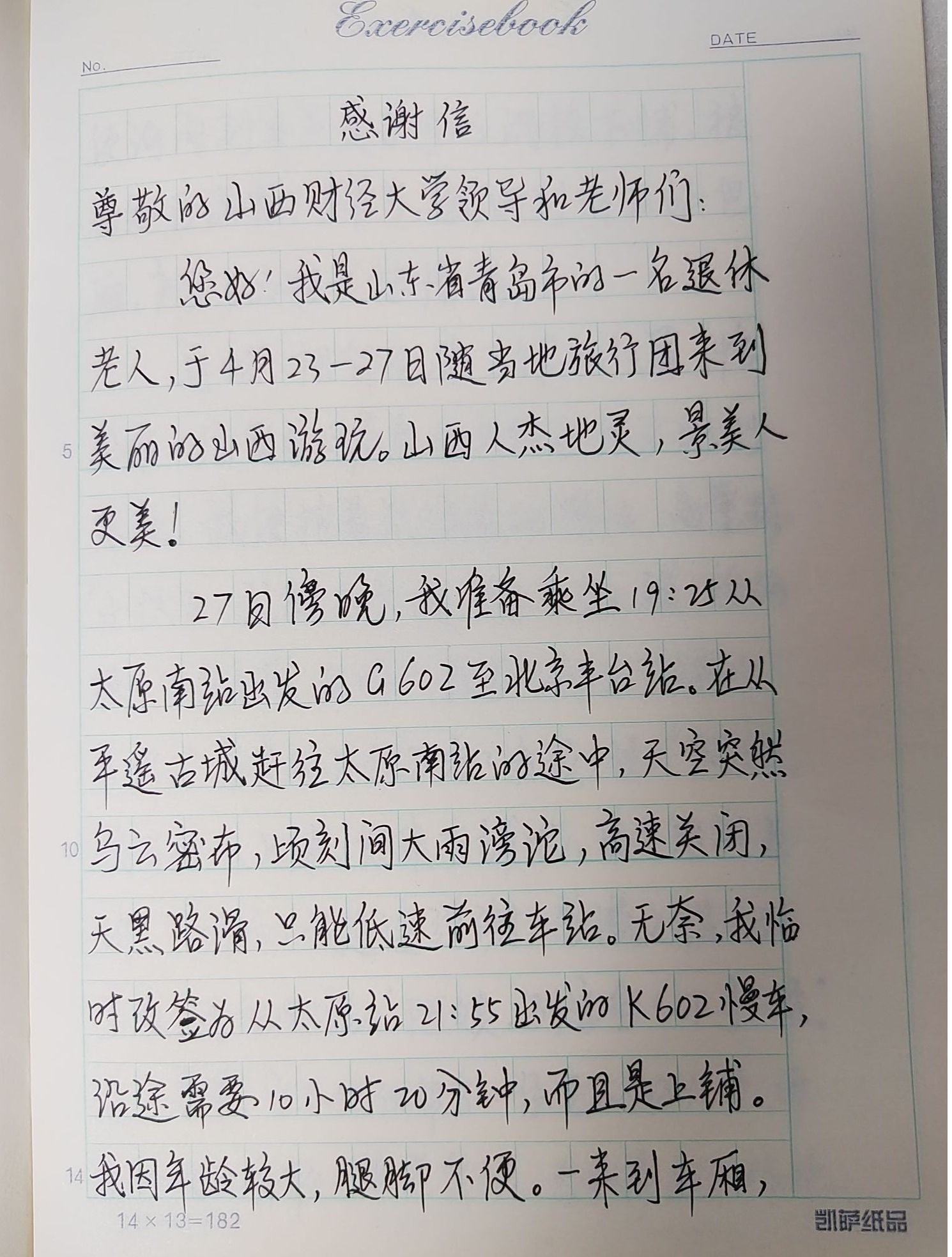 近日,我院2021级信息与计算科学班强秦浩同学在K602次列车上遇见了一位由山东青岛来太原旅游的退休老教师。由于老教师腿脚不便,加之当时天气恶劣,未能赶上去往北京的高铁,所以购买了此次普通列车,由于列车席次不足,没能买到下铺票,强秦浩同学见状,主动地把自己的下铺让给了这位老教师,他的行为极大地打动了这位老教师,并在到达目的地之后给学院发回了感谢信。