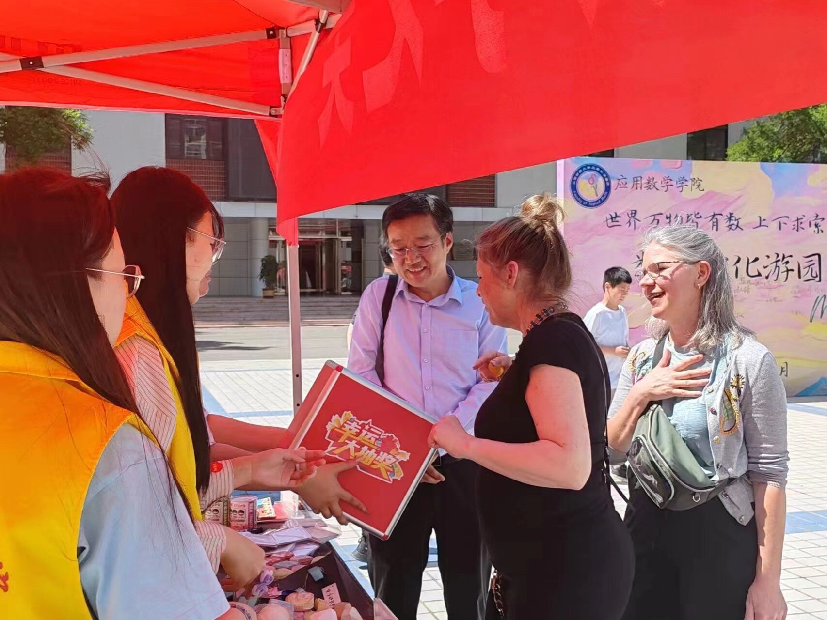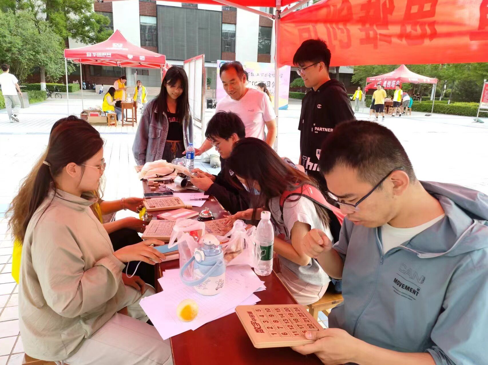 游园会以“观数学之美,体数学之妙”为主题,于5月26日在积雅楼广场举办。游园会划分为趣味数学知识科普区、数学游戏活动区和数学文化作品展览区三大板块。科普区依托7块精美的展板,学院志愿者向大家讲解莫比乌斯环、心形曲线、斐波那契数列等数学知识,以融会贯通的方式向同学们传播数学之美。在游戏区,速算一条龙、数学猜谜、汉诺塔、华容道、数独、九连环等内容丰富、形式多样的数学游戏吸引了众多同学,趣味数字梗和三行诗也得到大家的积极参与。数学文化作品展览区向全校师生展出了本届优秀数学文化作品。